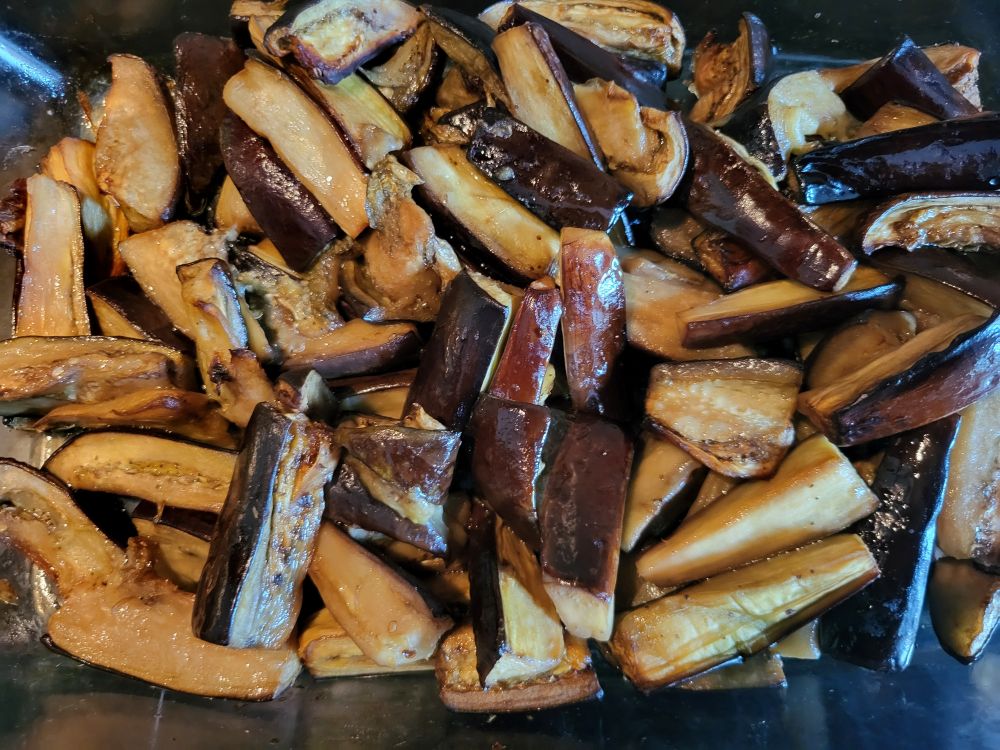 天气好,九层塔(图三)长得旺。搞个三杯茄子(图一)吃吃。茄子吃油,一般的茄子菜都要先炸过,费时又不健康。现在茄子用一点点盐杀杀水,盐不要放太多,否则会过咸,然后用植物油拌一拌。放到烤箱160度烤30分钟,拿出来翻一翻。再放入烤箱,160度30分钟,就成了图2的样子,比炸的效果好还不油腻。