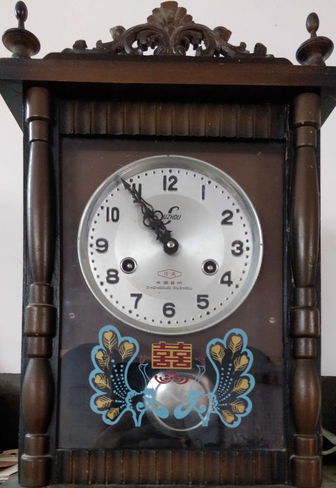 我父亲也有一口他喜爱的老钟,是37前(1982)从我舅妈的钟表厂买的,据说还是舅妈亲手装的。这是一口苏州牌的座式老钟,大概二尺高,古色古香,每到整时,嘡嘡嘡一记不漏地按点敲响。钟声浑厚悠扬,住在隔壁的人家都能听到而按时作息。老钟跟随了父亲几十年,滴滴答答是轻柔的问候,嘡嘡当当是不懈的提醒。