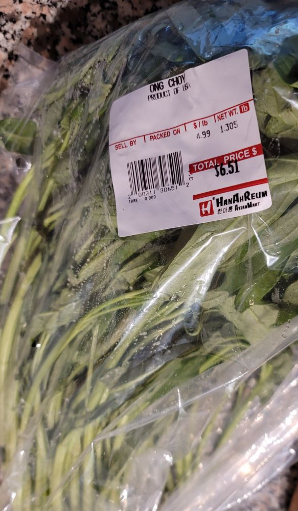 这菜价不低,这点空心菜6块多钱呢。5块一磅,有时候6块一磅。