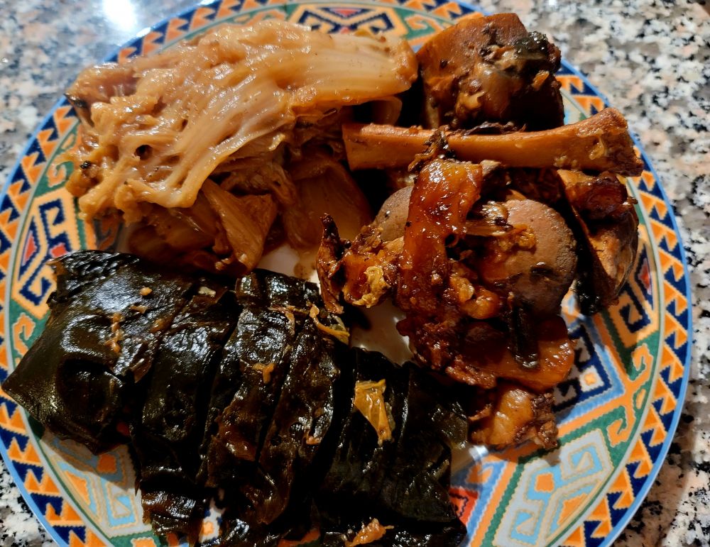 这盘菜特别好吃,从小吃到大的一道菜。小时候一到过年了爸爸就要做这道菜,它需要的功夫很多,海带要泡洗卷,小鱼要收拾,骨头、肉、干豆腐皮也要卷,最花时间的是做起来要四五个小时。很多时候都要做到下半夜。那时候还是用炉子做菜,一个大铁锅做满,盛出来之后冻起来慢慢吃,吃到过完年,每顿也是每样拿出一点来,切一切,摆成一大盘,真是好吃!