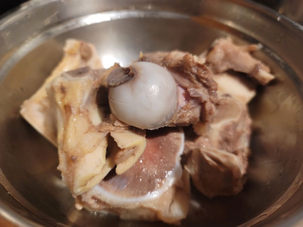 我通常会用脊骨、五花肉之类的做,这次说因为看到冰箱上次做菜剩下的骨棒,还有海带,就去韩国店的时候买了一小颗白菜,骨棒焯水,放料酒、大料和姜片。