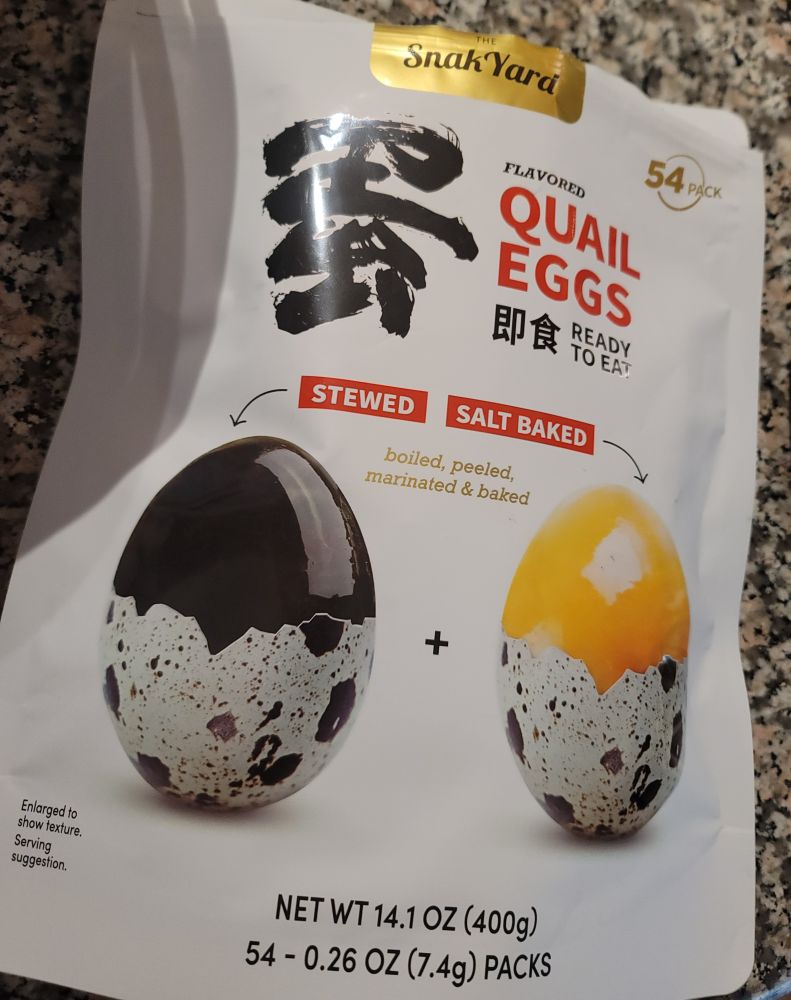 昨天在Costco买了一包鹌鹑蛋,记得还是小时候吃过鹌鹑蛋,但是是罐头的,没啥记忆了。尝了尝,还行,就是蛋清有点硬,也不是多硬。但味道挺香的,真就是零食。不贵,记得过去挺贵的,因为说营养比鸡蛋高,三四个顶一个鸡蛋,胆固醇比鸡蛋少,蛋白质比鸡蛋多。尝尝鲜儿吧。对,还买了松花蛋。去Costco的时候看见一个老美退咸鸭蛋:)估计回家一吃齁咸的,也不知道咋吃吧,就像我也是,有些西餐真不知道为啥显得那么好吃,根本不想吃,也不喜欢,不馋:)不知道他为啥买的,是不是以为像煮熟的鸡蛋那样,买了回家到时候就可以吃了,没想到一口咬下去那么咸。也就是Costco,别的店是肯定不能给退的,吃的东西多半是不给退的。松花蛋估计他们更不吃了,味道从来没有体会过的。