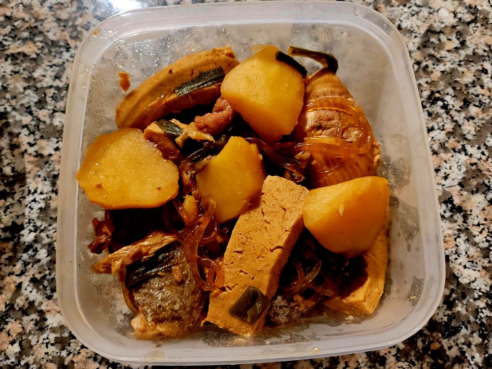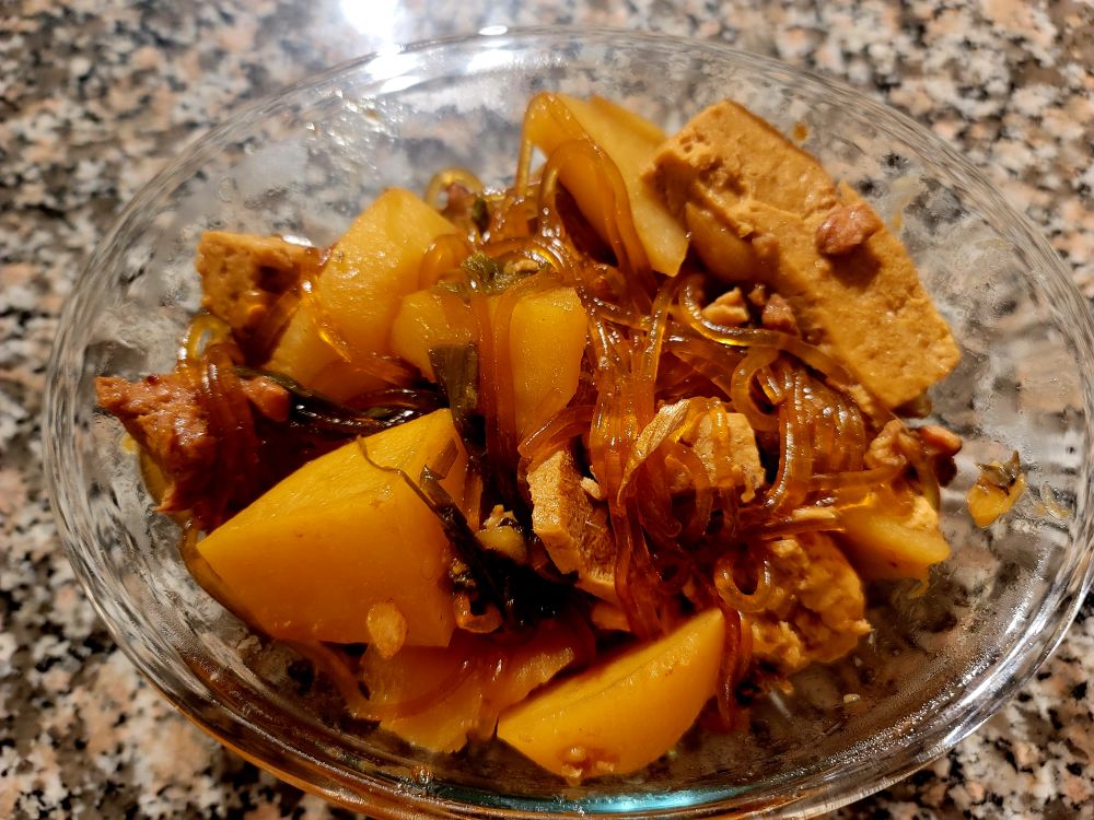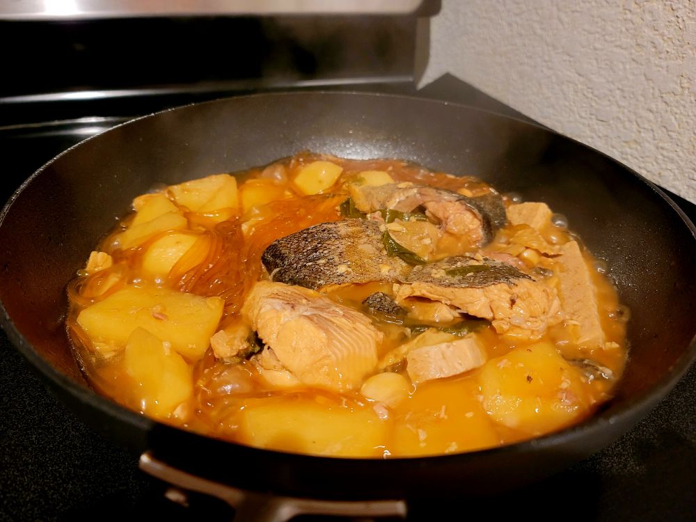 在Costco买了鱼,做了一锅得莫利炖鱼,鱼,土豆,冻豆腐,粉条,味道好极了。分开盛出来,我专门吃粉条,豆腐和土豆,胖人的美食,少吃点没有关系的。