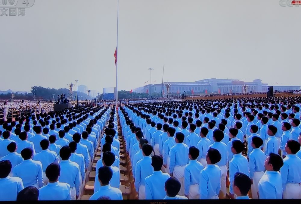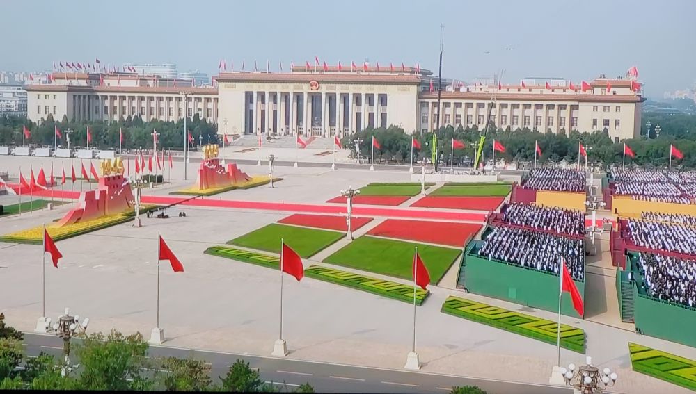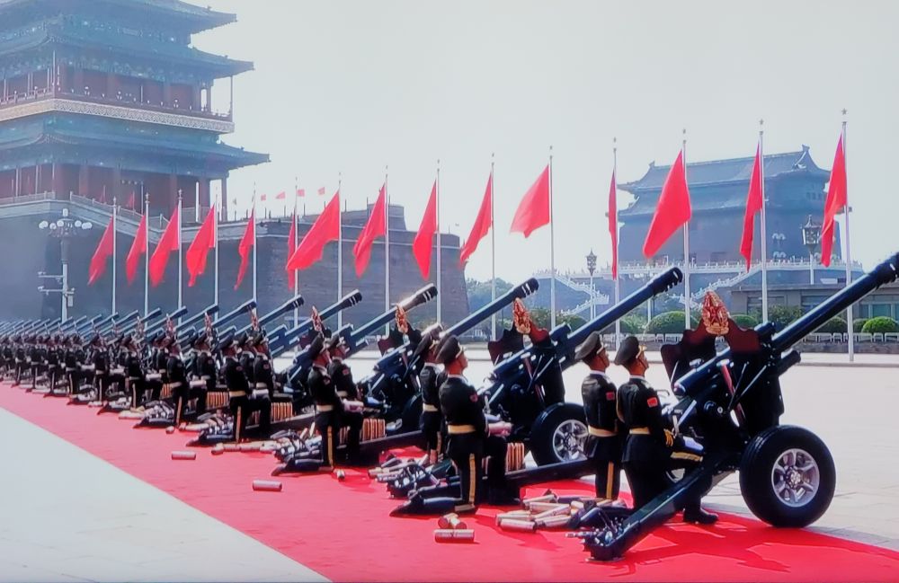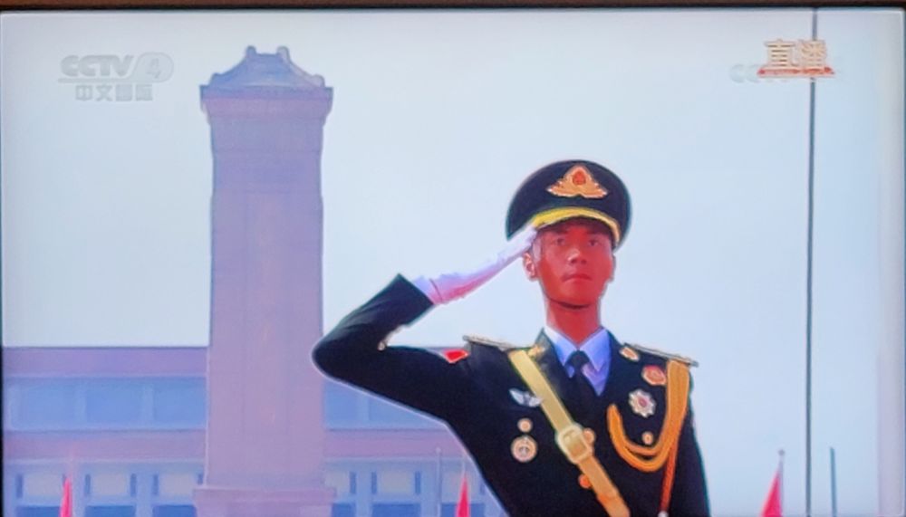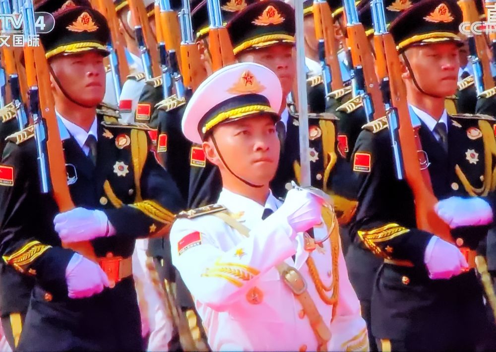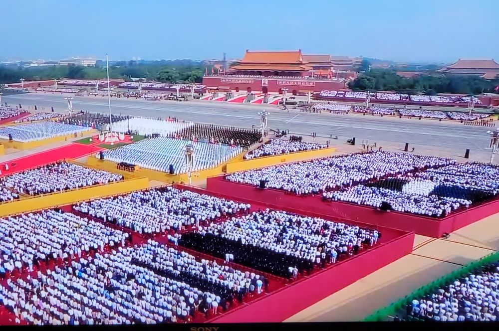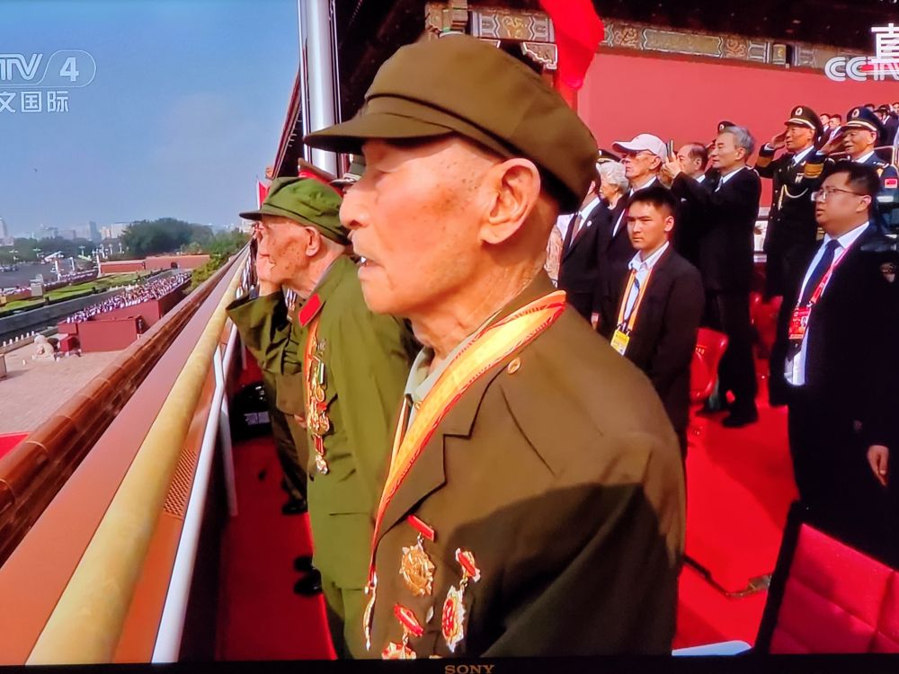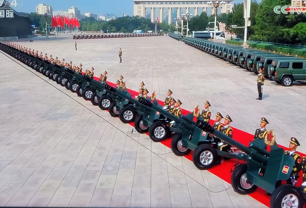 80响的礼炮,那么多整齐的队伍从我们眼前走过,他们经过了几个月极限训练才有了今天几十分钟的精彩表演,看过他们训练的视频,太不容易了,他们昨天上场前也是每人喝了一支藿香正气水的,防止中暑,昨天北京是80多华氏度,很热的,看下边的观众也都热得出汗,太阳直晒着,而且他们都凌晨就从家里出发来集合的,真不容易!