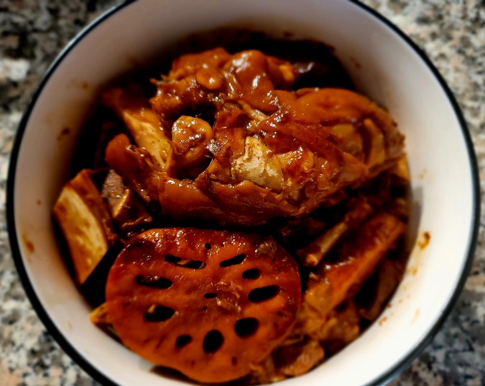 “这酱猪蹄加了藕,也是预制菜吧”,哈哈哈!我也是经常肉啥的炖多了,之后喜欢一个劲的放蔬菜进去炖。:)