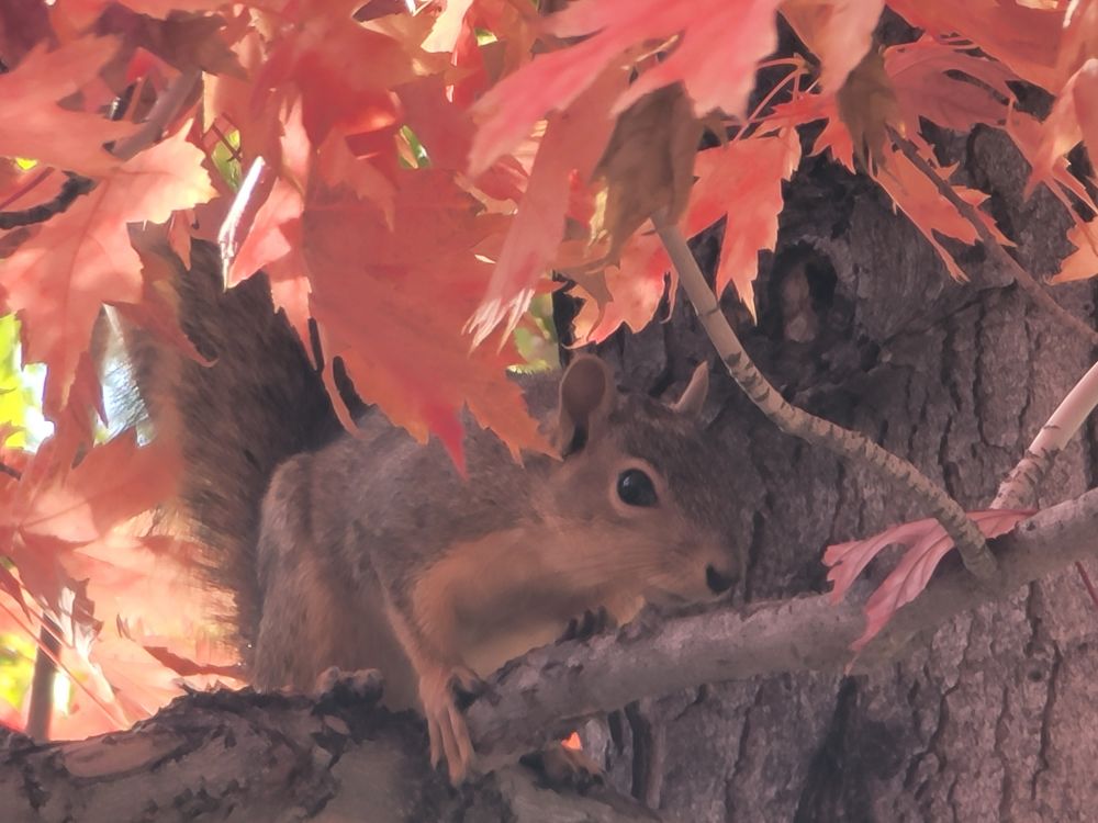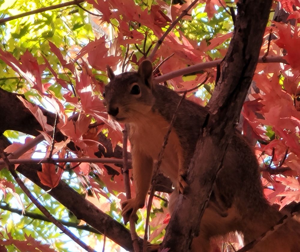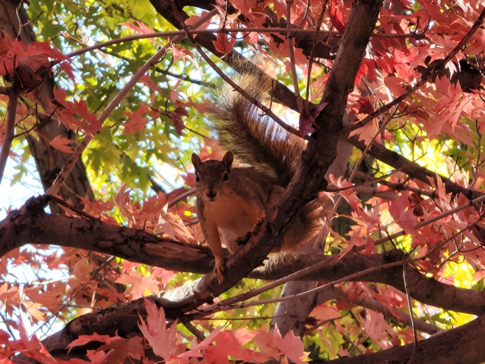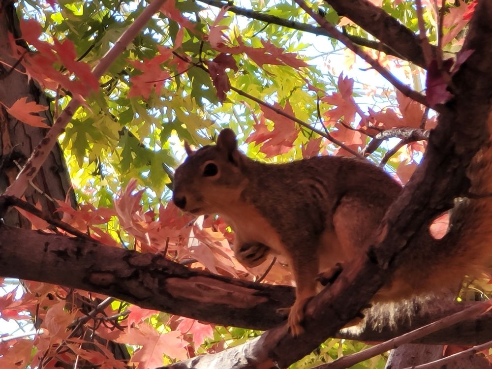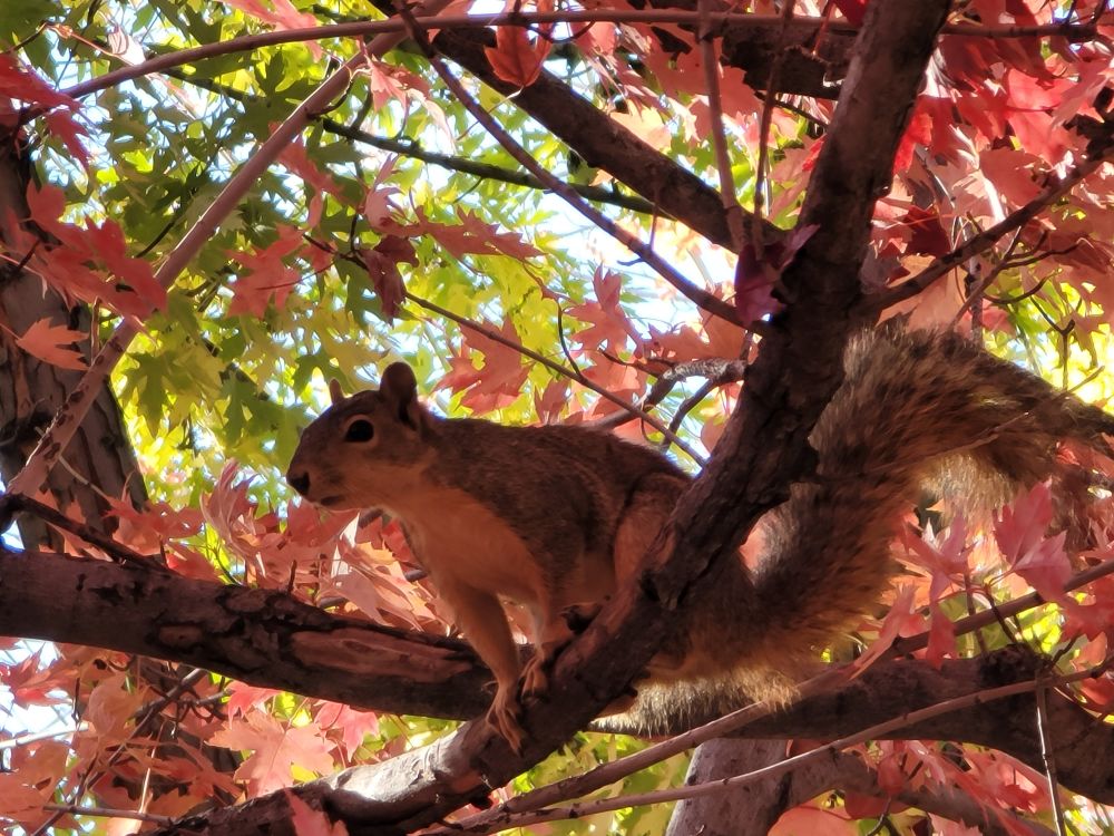 走路遇到了这只小松鼠,不知道跟上次的是不是一个,反正挺机灵的,上蹿下跳的也不怕人。过去外边小动物挺多的,像兔子、松鼠比现在多多了,松鼠发生意外的比较多,像车祸什么的,经常看见路上又被车压了的松鼠。兔子多半是被郊狼给吃了,郊狼有段时间经常在我们周围出没,还有大郊狼带着小郊狼在路上走的。