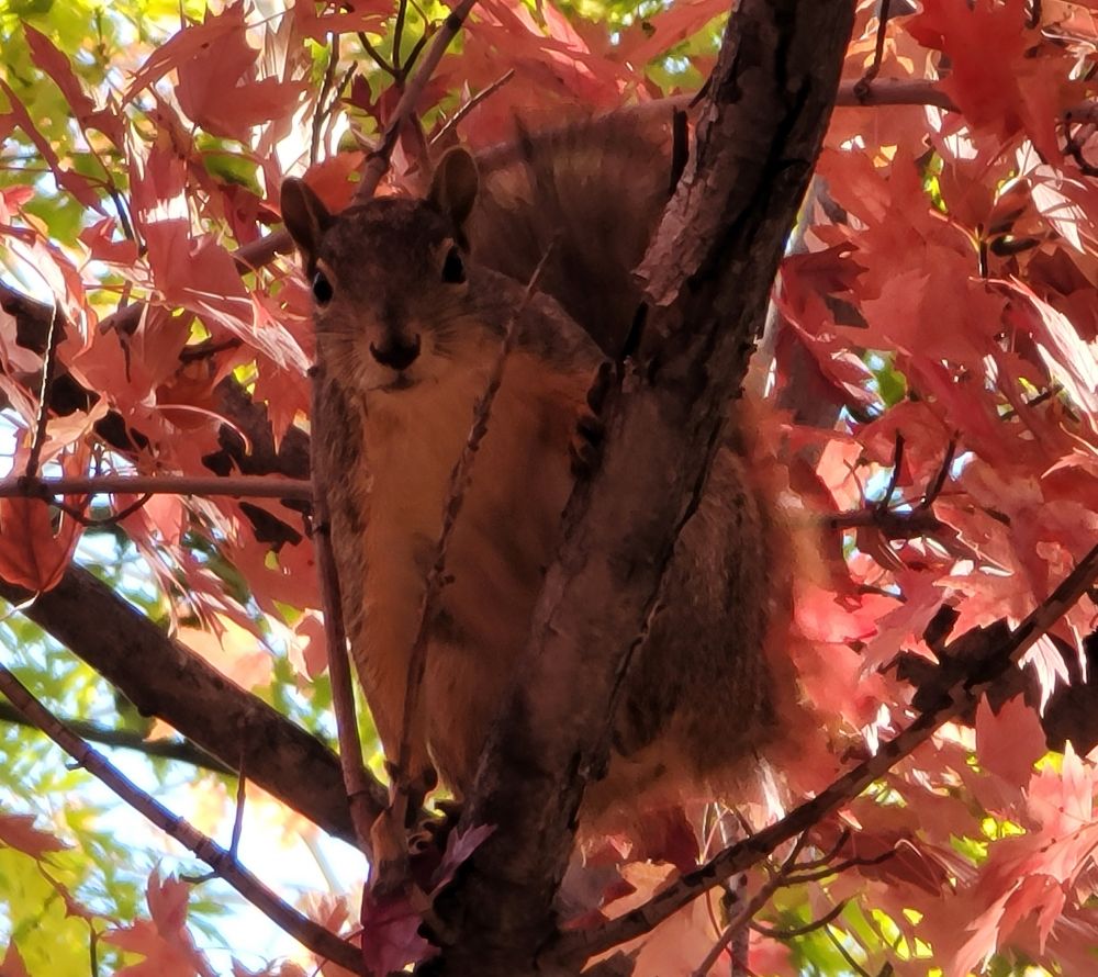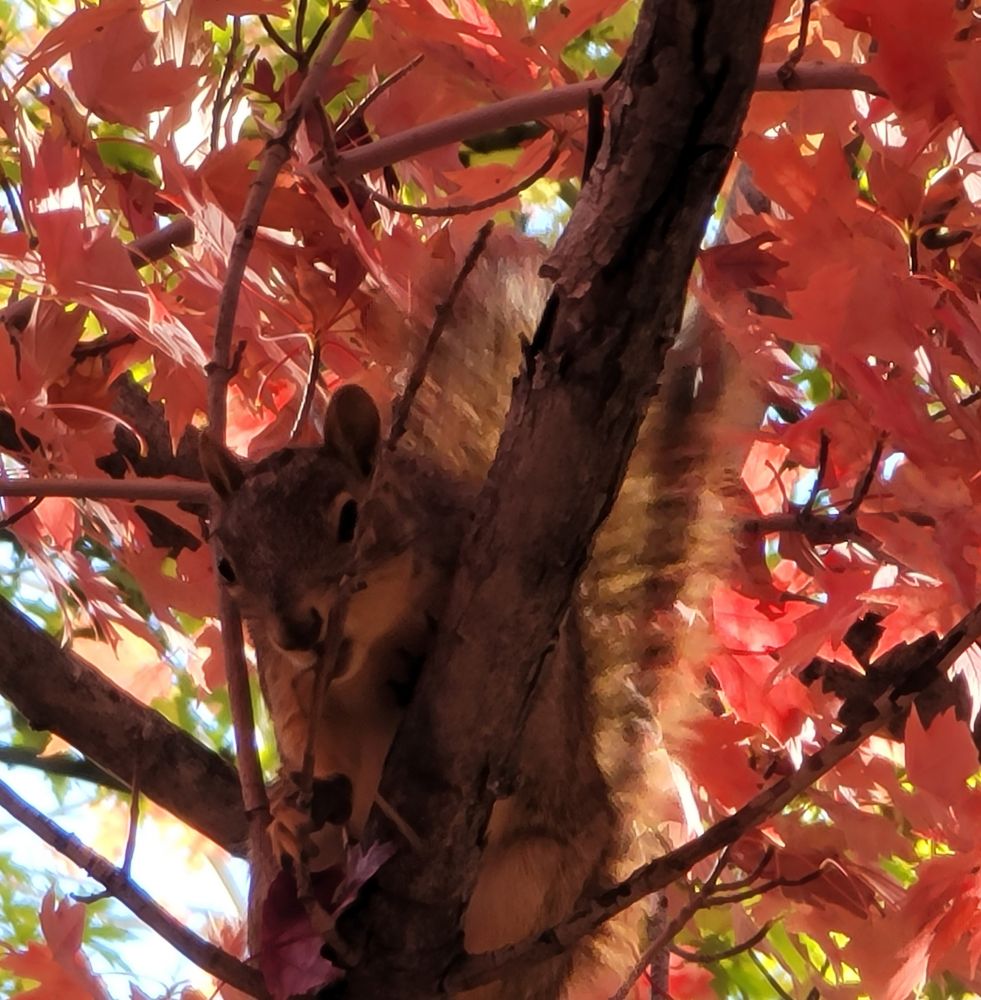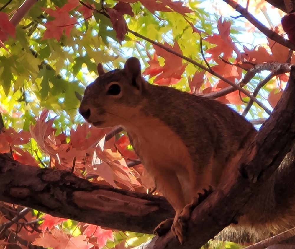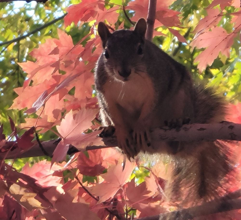 走路遇到了这只小松鼠,不知道跟上次的是不是一个,反正挺机灵的,上蹿下跳的也不怕人。过去外边小动物挺多的,像兔子、松鼠比现在多多了,松鼠发生意外的比较多,像车祸什么的,经常看见路上又被车压了的松鼠。兔子多半是被郊狼给吃了,郊狼有段时间经常在我们周围出没,还有大郊狼带着小郊狼在路上走的。
