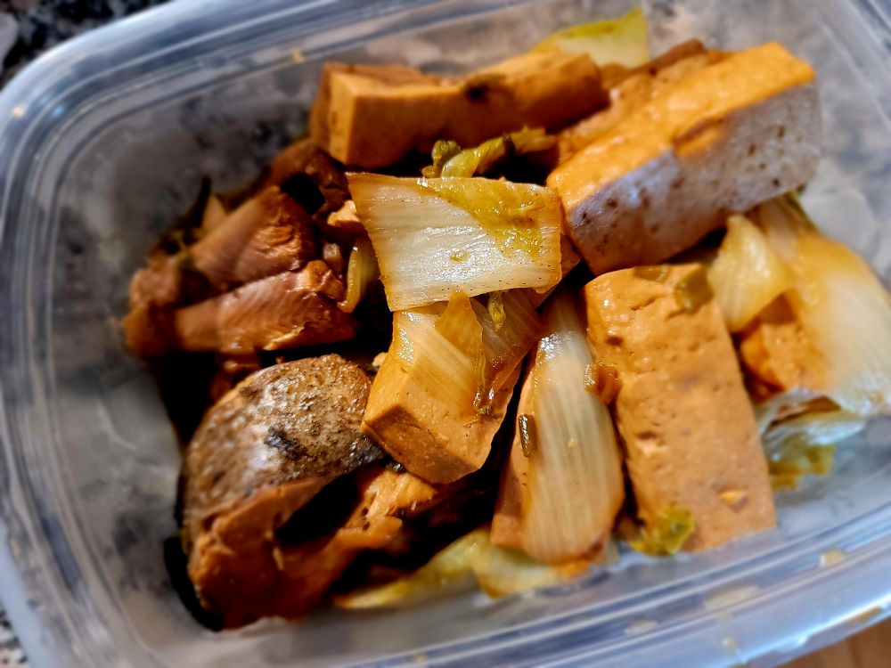 好久没有做鱼了,冰箱里的鱼炖豆腐加了一些白菜,非常好吃,我喜欢吃炖鱼里面的菜,多半的白菜和豆腐都是我吃的。做饭没别的就是花时间,千滚的豆腐万滚的鱼,越炖越好吃。还有说豆腐和鱼炖产生的钙非常多,天天吃钙片呢,多吃点少吃点豆腐炖鱼不要紧的,但那里面的豆腐特别好吃,所以我吃豆腐多。现在豆腐可是不便宜。