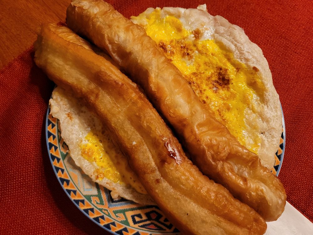这是今天早上实验的煎饼果子,饼不够薄,老公说不够脆,我没吃,油条我觉得太油了,他喜欢。放了甜面酱,没有放葱花,下次再做的时候改进吧,反正味道是不错的,我尝了一口饼。