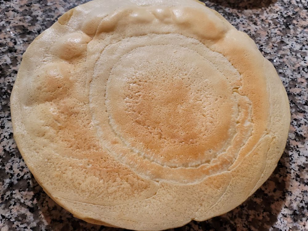 我放了半碗小米面,一碗半白面,放了牛奶鸡蛋糖,一点点苏打。面稀稀的,倒锅里用摊煎饼的小竹子工具一转一张,很省事。