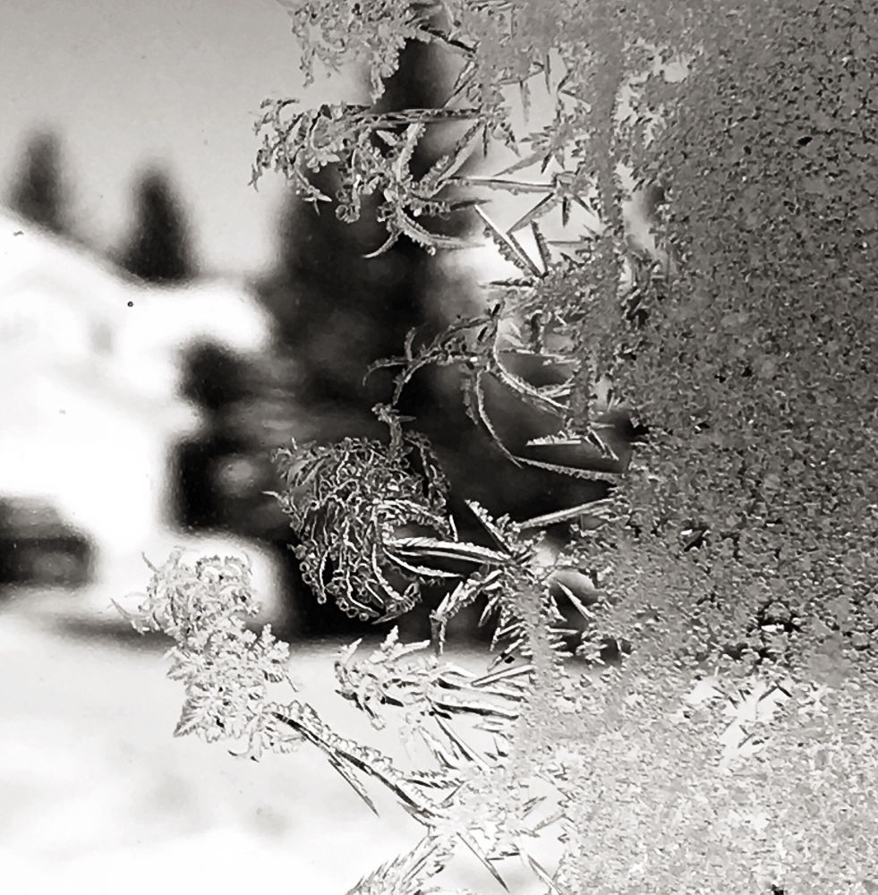 图3:蹦跶着去拉窗帘时发现一扇窗户上的冰花,手机很难聚焦在冰花上,单脚又不能久站,只好一屁股坐在地板上,拿着手机左摇右晃了好几分钟后,终于有三五张似乎聚焦上了冰花,勉强挑出一张,完成第3天的任务。