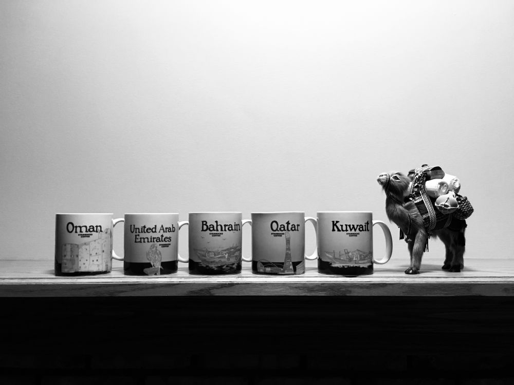 图5: 星巴克杯子,旅游的纪念品,有纪念意义,还很实用。在中东时走过的五个GCC国家(从骆驼方向数):科威特,卡塔尔,巴林,阿联酋,阿曼。GCC是指海湾阿拉伯国家合作委员会,简称海合会,共有六个成员国,还有一个是沙特,因女人入境后就要穿黑袍,没有去,如想知道关于海合会更多内容,可放“狗”去搜。