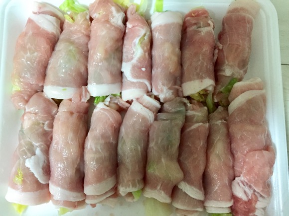 用超市卖的那种很薄的肉片,把细切后的芦笋,或卷心菜等包好,放到不粘锅烧一下即可。放便当里还比较好看。