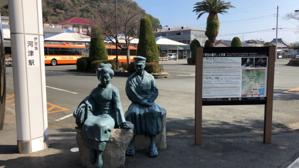 在河津站看到了以文学大师川端康成的“伊豆的舞女”著作为原型的雕像,当年还在伊豆半岛拍了电影,是山口百惠和三浦友和主演的,非常经典。