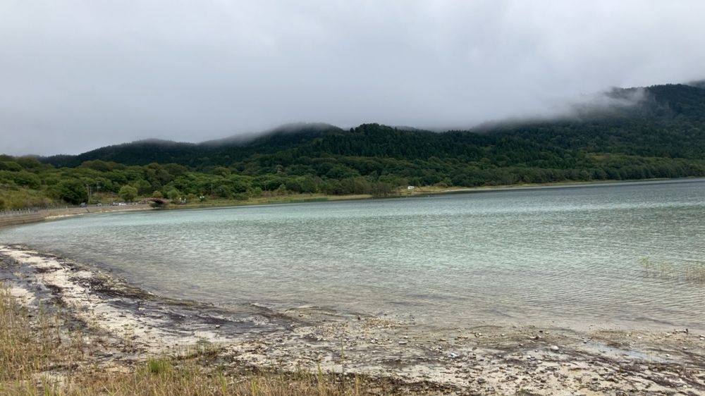 山中被火山产生的硫磺气孔冒出的蒸气与硫磺臭气所笼罩,有一些云山雾罩的景象。而呈现在面前的火山口湖畔又是透明寂静的湖水。
