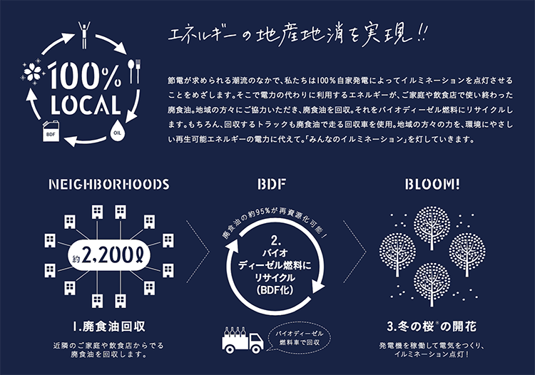 点灯活动的能源来自目黑川附近的饮食服务行业和各个居民家庭回收的废弃食用油,回收活动大概从夏天就开始,每个楼层的垃圾Station都会放一个回收废弃食用油的Corner,这些回收的废弃油会经过专业机构的分离提纯处理,储藏起来为年底点灯活动做准备。