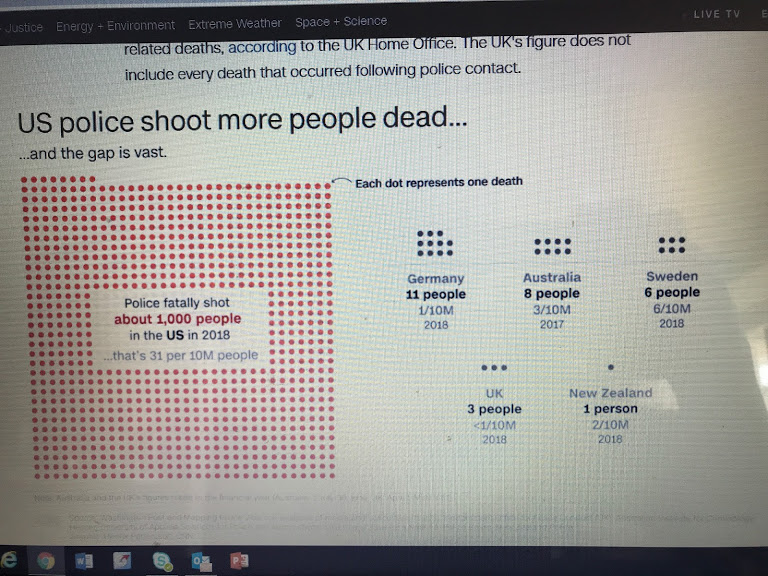 美国宪法允许公民有枪。美国是发达国家中拥枪最多,枪杀死人最多的国家。全国公民拥有3.93亿把枪,平均每人有1.2把枪。2019年,不算自杀,美国死于枪杀15000人。反对控枪者把无意车祸和故意枪杀等同起来,以此推论不需要控枪。即使把枪等同汽车,驾驶员起码要笔考路考拿到驾驶执照交renew费和年检买保险,为啥持枪者不需要笔考枪考执照交费年检买保险?这几年严重到哪怕一次群杀(mass killings) 枪死了二十几个小孩都没有把反控枪者们惊醒,美国作为一个国家最终无动于衷,悲剧继续下去。由于民众容易弄到枪,警察去追逐人时,首先想到对方是否身上藏有枪,要保护自己的命,就会开枪或过度(且不说滥用)暴力行为。所以这么多年很难告赢警察的一个原因就是:被起诉的警察说他觉得对方的动作是在掏枪。只要你的手动,只要你手不举起来,警察都可开枪打死你。枪本身是power的象征,持枪人会有这种power心理作用,无论是持枪的警察还是嫌疑犯,都有可能仅仅身上有枪而产生心理效应,在那种场合使用枪。所以,这次示威游行口号之一就是:“Do NOT shoot!".