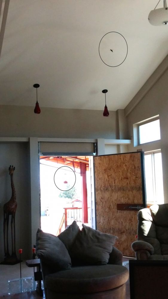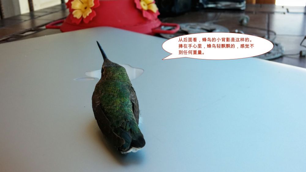 糖水瓶本是挂在距离60米处的另一栋矮小屋子前,文中已提到,昨天是临时起意拿过来引诱困在这里的蜂鸟。