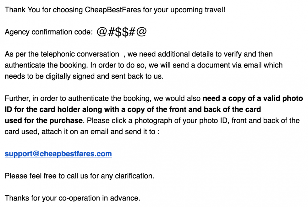 今天,接到一女工作人员电话,貌似印度英语。约翰和我强强联手,连蒙带猜勉强听明白了:订票人与买单人不对号,需要买单人提供更多个人资料,通过EMAIL方式发送,以验明正身。