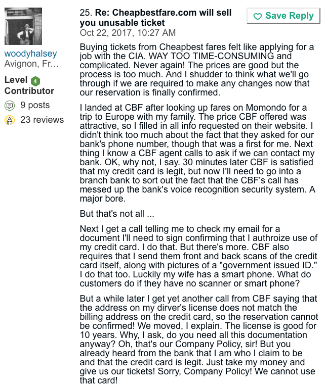 我马后炮,上网查该订票网站风评,看到一篇长文(截屏如下),文主痛诉从这个网站订到的机票有问题,无数电话沟通,对方敷衍了事。。。以及其他回复评论(截屏如下)。发现还真有人把驾照及信用卡双面全扫描发过去,我可没这份胆量。江湖险恶,即使借我几个FBI或CIA的熊心豹子胆,我也不敢去冒险。