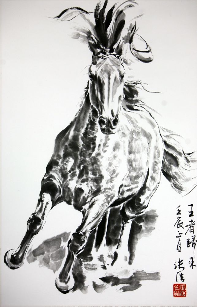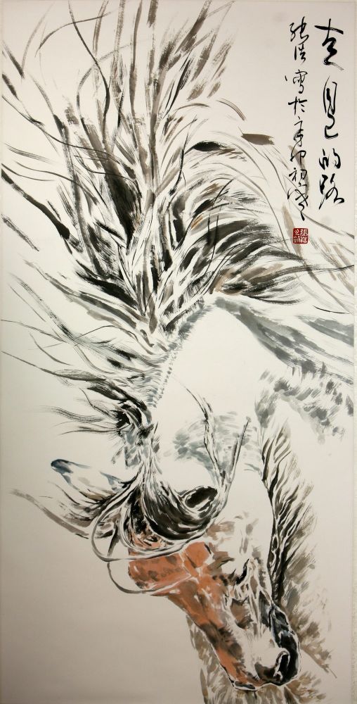 当今画马者多学悲鸿,几乎无马不徐。但这些人大约都不曾对马写生,只是模仿秀,差别在像不像大师。模仿高手即使画得像,也是没有自我,没有魂魄的马。但张浩不是这样,他画的是非模仿的马,是在写生基础上又融汇各家(包括悲鸿但不限于悲鸿)的马,是中西合璧、兼工带写的马。简言之,是原创的马。张浩的马既有骨骼结构和素描的基础,又有中国画的笔墨表达。画马的角度,前人多侧面或半侧面,但张浩敢于挑战更难的全正面。画马的取景,前人多全身四蹄,但张浩能推近到半身乃至头部特写,犹如摄影的现代化,在构图和题材表达上同时突破樊篱。画马的动态,前人多立马和奔马,但张浩所作,有卧有仰,或打滚蹭痒,或振鬣扬鬃。在外行人看来,马就是马,马都是马,但张浩却能看出并画出马种的不同,犹如西欧与东亚、南美与北非人种之不同(如《黑与白》)。在我看来,这些都是超越前人的,也都是基于他上述那些与众不同的经历。