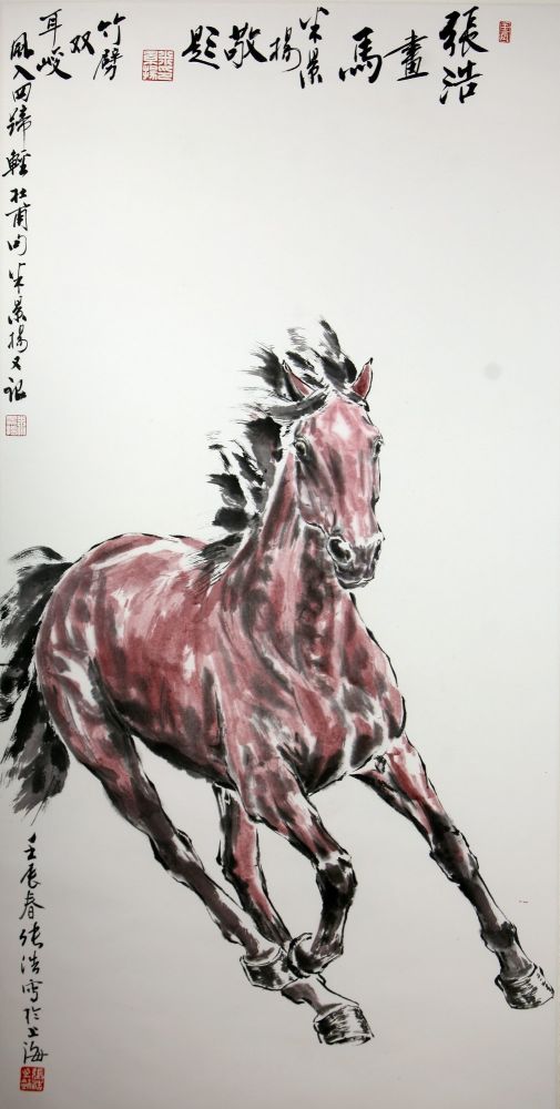 我与张浩兄同居一城,却相识未久,相见恨晚之后,立即引为同道。初次见面饭桌上听他说画马,我提到了徐悲鸿的学生刘勃舒,他立刻站起来与我握手。他很快邀我去他家,见到几幅大画原作,我说他自己署款的字比名人题字更好,他又一次与我握手。后来他也到了我家,对我自己动手改造旧房的装修成果,他不仅从技术层面看,更提高到文化、美学和哲学的高度,说我是文化游子,在异乡营造理想的家园。我俩就这样互相赏识,惺惺相惜。我写此文全出己意,他尚不知。我猜他读了以后,是再次与我握手,还是要浮一大白呢?