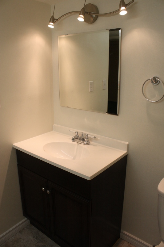 在Lowes降价时买了最便宜的水池连柜200元,马桶是Costco的100元出头,家里有贮存多时的Canadian Tire水龙头,一并都装好了。