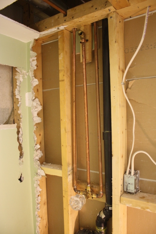 第二步是拆开隔墙和顶部的灰板,全新安排上水铜管。为给铜管腾出空间,还先给属于下水的回气管改了道。同时,焊好了淋浴的控制阀和出水口。