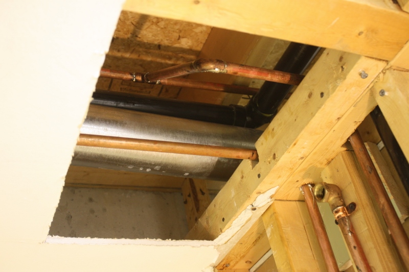 比较困难的是钻进顶棚里,接通冷热水管。这既要注意排空管中余水,有一点也焊不上:又要注意隔热阻燃,别烧坏了附近的其它材料。