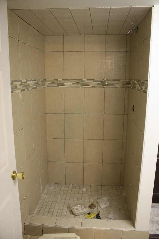 顶部也要贴6x6的白瓷砖,这是因为低屋顶离水喷头太近,光靠灰板是耐不住水汽熏蒸的。