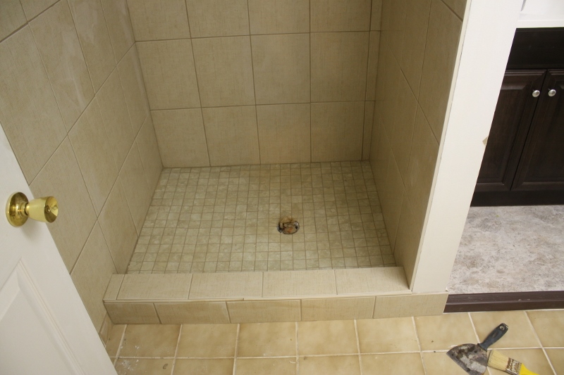 底部的挡水台阶也要用瓷砖包砌,水泥坡底上须用另外的2x2小块瓷砖。