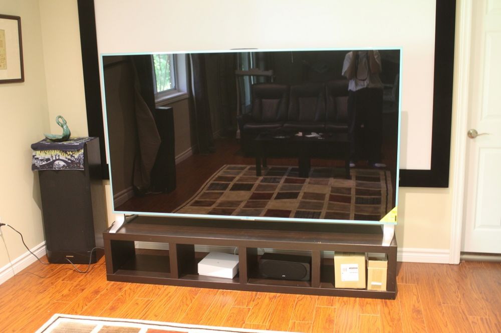 终于把电视机运到家了,费了好大劲才搬进屋内。事前曾经反复斟酌,应该把它放在哪个房间?家庭厅是看电视的地方,但是我在博文里秀过,其整体布置都是中式古典主题,棕黑色调,如果冷不丁放进一个银色的摩登电视,还那么大体量,就太不协调了,我匠心安排的室内装饰风格就全打乱了。因此决定把新的巨大电视放到地下室里,我原本安排那里就是家庭影院。我们是经后院从后门直接进入地下室,避免了从室内楼梯上搬运的难题。