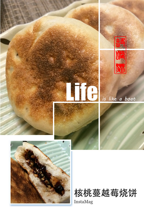 原想做葱油饼当早餐的。头天晚上发了面,第二天早晨才发现家里一根葱都没有。只好临时改变主意做了个甜烧饼,核桃仁配蔓越莓干。蔓越莓干酸酸甜甜的味道配上核桃的香味,相当不错。