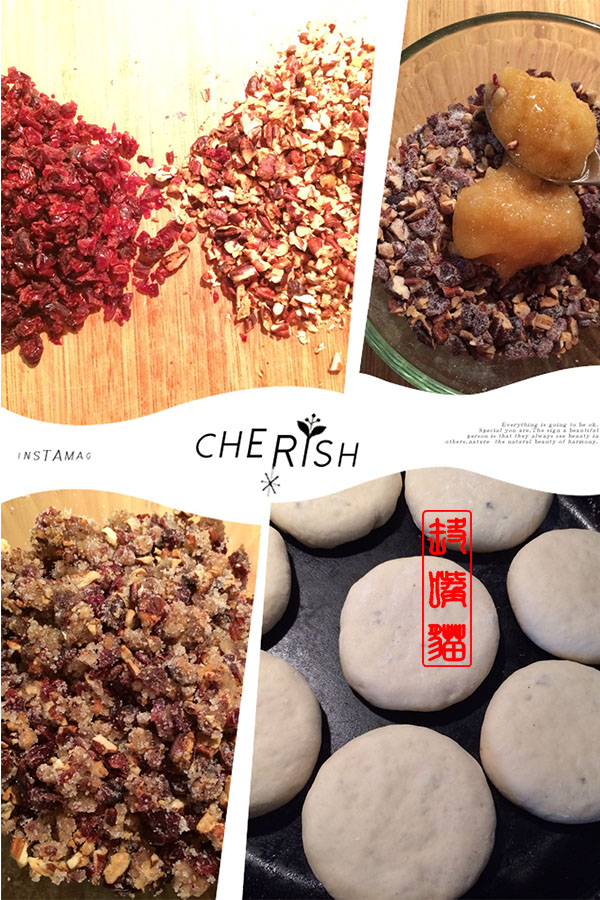 馅 核桃 80克,蔓越莓干 80克,白糖 100克,糖浆或蜂蜜 1-2 TBSP
