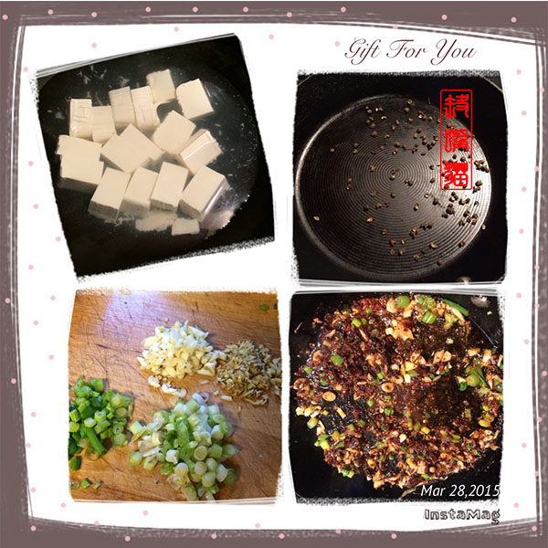 配料 猪肉末 50 克,葱 4 根,姜 5-6片,蒜 4-5瓣,豆豉 1 TSP,豆瓣酱 2 TBSP,辣椒粉 1 TSP,花椒 1TSP,酱油 1TSP,糖 2-3 TSP