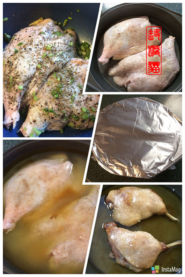 3. 放入烤盘,倒入鸭油后用锡纸包起
