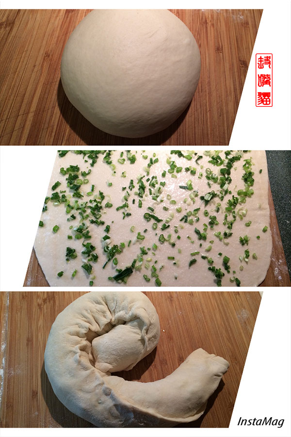 5. 将面盘成圆盘,擀开成面饼