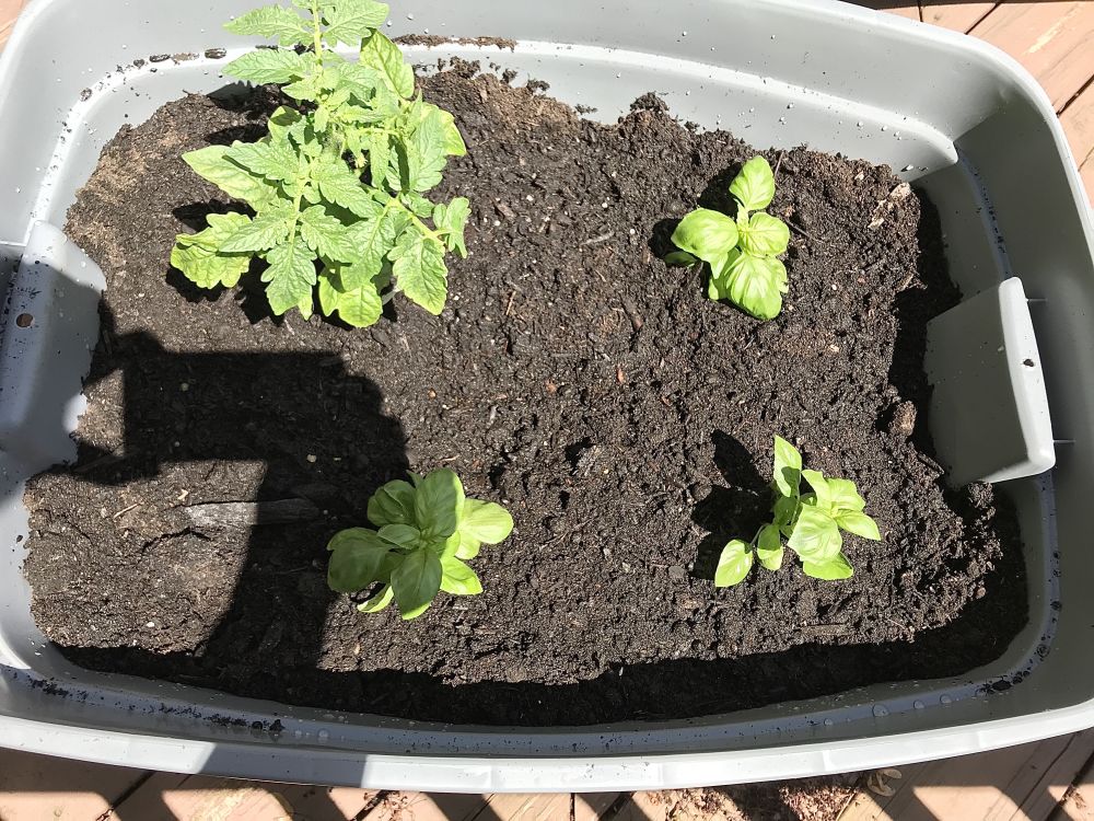 我这周在家休假一周,决定种点西红柿和九层塔(basil). 跟油管视频学了一个Wicking 技巧(如灯芯传油技巧),下面埋了两盆土,和水,上面种花或菜。明天要下雨了,看看这个实验成功不成功。如果可行,在阳台上种菜既不脏,出门几天也不担心蔬菜干死或涝死。图一HomeDepot店旁边的board walk。图二,两个20加仑的塑料盒子。图三四,灯芯技巧。图五,六种下去的西红柿和九层塔。