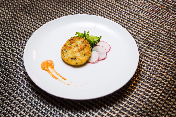 煎到酥香的蟹饼,配上自己调制的烤辣椒酸奶酱