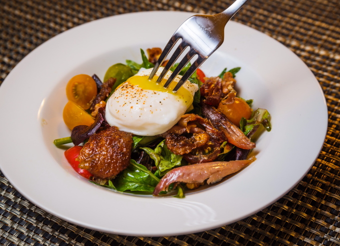 新鲜的色拉菜加意大利黑醋调料拌匀,加入烤香的核桃,西红柿,