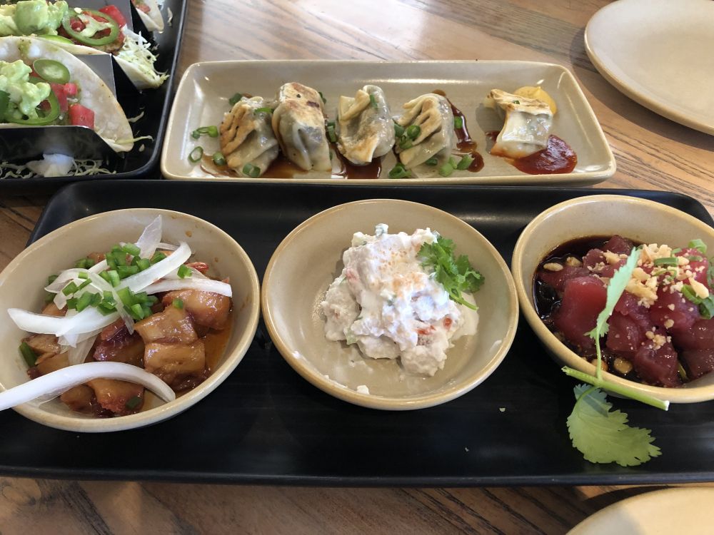 因为主要的活动在下午五点以后,白天就比较清闲,去我喜欢的捕鲸村闲逛,在一家叫做“Monkey Pod Kitchen”的饭店吃了午饭。跟着年轻人一起活动真好,可以认识新事物,吃到新东西。这家餐馆的食物有比较浓郁的当地风格。知道我喜欢刺身,小女儿点了一道开胃菜叫Raw Bar Mixed Plate ,生鱼拼盘。这让我认识了一道菜: ”Poke”。这个拼盘上面有三道小菜。其中的两道,一个是金枪鱼Poke,另一个是章鱼Poke。第三个是带椰子味道的酸橘汁腌鱼。所谓的Poke,就是把生鱼切成块,拌上特别的汁。这是传统的夏威夷食物,而我是第一次吃到。感觉比生鱼片更有滋味。