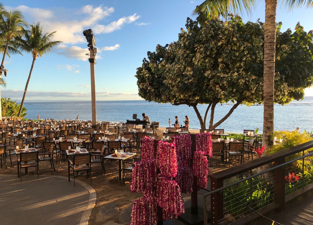 12月20号星期四的活动是在晚上,夏威夷风格的歌舞盛宴(Luau)。在茂宜,有时会看到牌子上有Luau的字样。我们住的度假村也有Luau。不过今晚的Luau是大女儿几个月前为我们专门订的,叫做“The feast at Lele”。地点就在拉海娜(Lahaina)著名的“前街”(Front Street),离我们住的地方也不算远。拉海娜过去的名字就叫“Lele”,前街这个地方曾经是夏威夷王权贵族们的居住地。当然,那时候前街也不叫前街,而叫“国王之路“(the King’s road)。据介绍,1919年的一场大火几乎毁掉了整个“前街”。