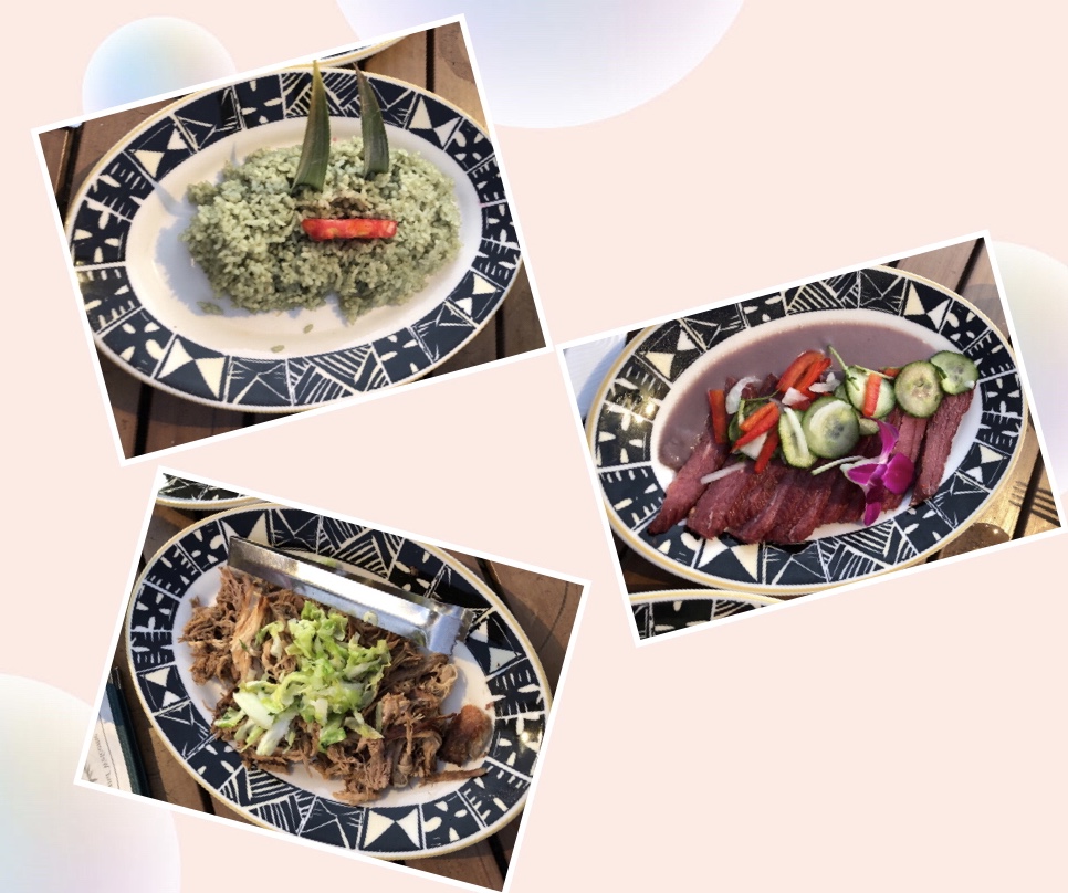 嫩芋头叶包裹的红烧椰子奶咸牛肉配烤乌鲁;