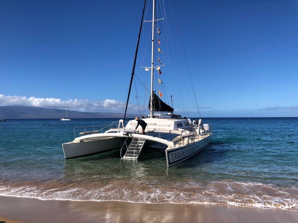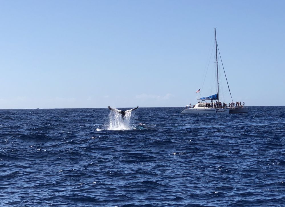 我们订的这家观鲸鱼船公司叫“三部曲’(Tralogy),是家族拥有和经营的。这个家族有着酷爱航海的历史 。 据介绍,在二十世纪二十年代, 埃尔登和雅富顿两兄弟在华盛顿州汤森港建造了一艘渔船,并开往阿拉斯加。1971年,家族打造出了50英尺帆船“三部曲”。 从阿拉斯加出发,到墨西哥,中南美洲,加拉巴哥群岛以及最终的南太平洋, 向北航行到夏威夷,希望得到休整后,再继续他们的“环游世界”奥德赛。然而, 他们爱上了夏威夷的岛屿,从此定居在茂宜岛上。我们乘的船是1986年造的“Trilogy Elua”, 55英尺定制单桅双体帆船。