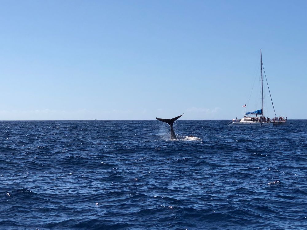 每年的12月15日到笠年的4月15日是出海看鲸鱼的最佳时间。二月份则达到了赏鲸鱼的高峰期。出海看鲸鱼是来茂宜岛之前就在网上订好了。游票除了乘船出海,还包括了快餐小吃和酒水。看鲸鱼活动两小时,再加上上船下船,三个小时时间足够了。我们订的那家每天有三班船出海,早晨8点,10点半,和下午1点半。我们选了个10点半的,不用早起,赏鲸鱼结束后,下午还有时间安排别的活动。