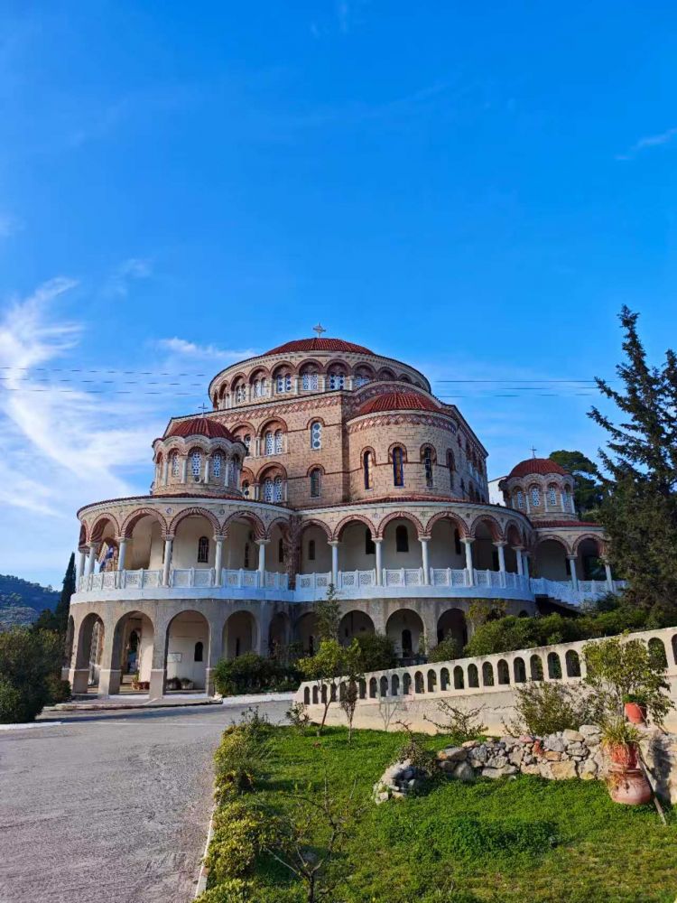 当我们在岛上吃饱喝足,晒完太阳,才下午两点,离我们买的回程票还有好几个小时,我俩就想着去别的地方看看。这里没有Uber, 问了饭店的跑堂,才知道这里有公共汽车。赶紧找到公交车车站,我们跟售票员描述了我们想要去的地方,岛的另一头,阿法亚神庙就在那里, 以及中间的一个地方,但是售票员跟我们说我们即将能坐的公交车是最后一班,不过我们可以在那里玩25 分钟,再坐同一班车回到原地。最后我们决定不去阿法亚神庙,而是直接在中途下车,然后等公车回程的时候我们再坐回来。我很庆幸我们临时做了这个决定,而这一决定给了我当日最大的惊喜。因为中途那一站,是圣内克塔里奥斯(Nektarios) 教堂所在地。