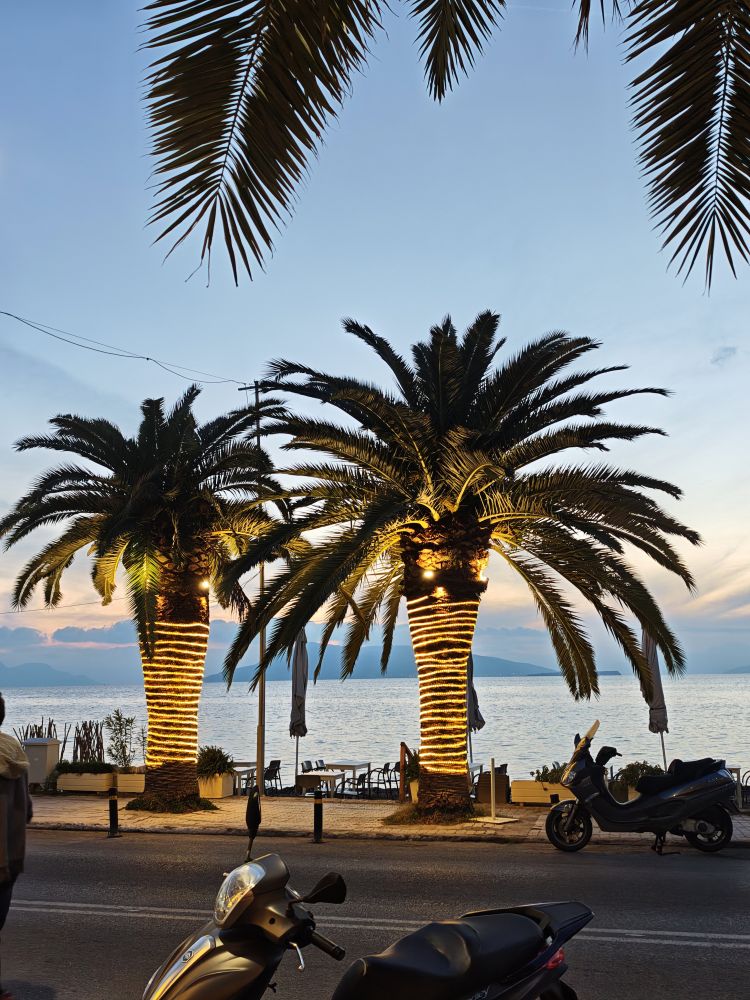 我们回到镇上又享受了一顿晚餐后,才去码头等船。在等船回雅典的时候,我们和那位女士又遇上了。于是我们就像老朋友一样互相交流起来,这位女士来自瑞士,父母是希腊人和波斯尼亚人,她喜欢希腊,所以在瑞士天气恶劣的时候(她对苏黎世的描述),把孩子交给老公,独自来希腊三天给自己放个假,她这次是专门跑到这里来看这座教堂的,所以她在教堂那里待了两个多小时,最后打的回程的,她第二天一早就要回苏黎世。我们从码头一直聊到船上,从瑞典瑞士气候的不同,收入以及物价的巨大差别,一直聊到教育的相似性和差异性。旅途中的偶然相遇,常常可以为记忆添上一抹亮色,与她的交流也为我们本就愉悦的一天增添了温暖的注脚。