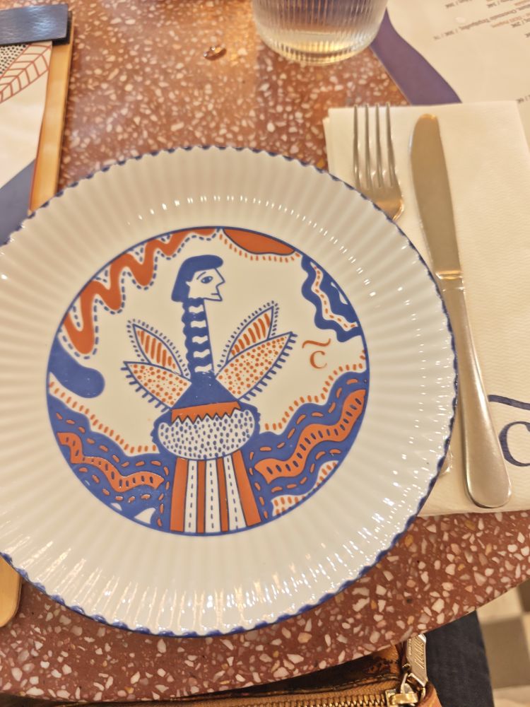这顿晚餐算是比较传统的希腊风味。我尤其喜欢这家店的餐盘,纹样典雅,很有希腊特色,与吧台后墙面的装饰也彼此呼应。点菜前,服务员先上了一瓶水(后来发现收费3欧元)和一盘开胃泡菜。我们点了一份配有熏鳟鱼的希腊沙拉、一份烤箱烤羊肉配土豆,以及餐厅自制的猪肉“Gyros”。儿子还根据我们点的菜搭配了两种不同的红酒。比起瑞典,雅典的物价亲切不少,尤其是餐厅的酒水——每次请服务员根据菜品推荐酒,他们似乎很少推荐单价超过10欧元一杯的选项。这顿晚餐,除了分量较大的“Gyros”,其他菜量都不算多,但我们还是点得稍多,最后未能吃完,有些可惜。餐后,店家赠送了每人一小杯甜酒,我不太懂酒,只觉得过于甜腻,尝了一口便放下了。