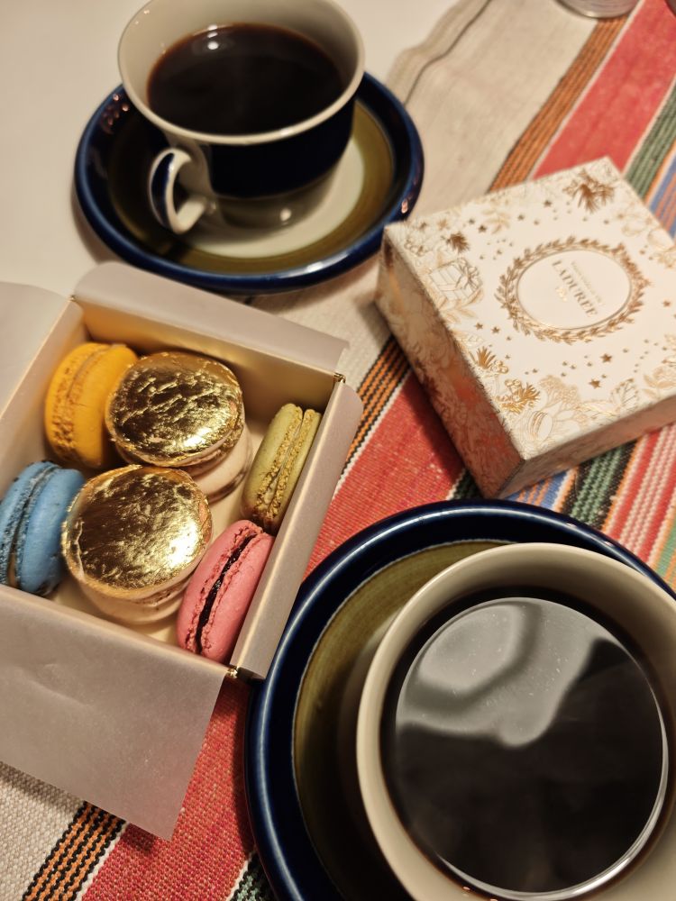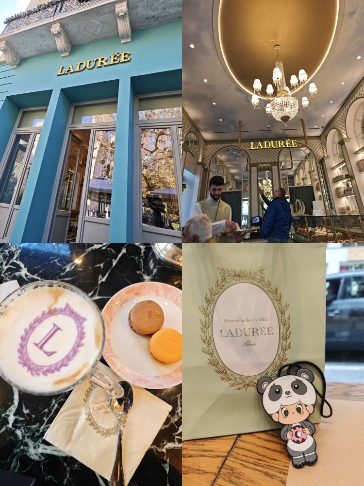 最后必须说一说Laduree。相信喜欢马卡龙的人都知道这家店,这家1862年创立于法国巴黎的甜点品牌,以其标志性的马卡龙闻名于世,被誉为甜点中的爱马仕。我们在雅典闲逛的时候,几次经过这家正在装修的店,大儿子有一次特地凑近去看了一下,说要过几天才开门。26号早餐后,小儿子已经去机场了,我和大儿子抓紧时间继续漫步在雅典的街头,而这一天,正好是Laduree雅典店开业,儿子显然比我兴奋,拉着我进去品尝这个甜品界的爱马仕。我们点了卡普奇诺,在店里吃了两种不同口味的马卡龙,还打包了八种不同口味,带回瑞典给朋友们品尝。不过必须说,不应该带,因为带回去第二天吃的口味跟我们在店里吃的差太多了。