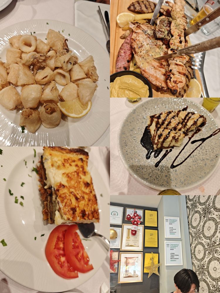 Liondi 是一家就在卫城博物馆对面人气很高的餐厅,网上也非常推荐。这家餐厅我们是等到小儿子到了以后才去吃的。点的都是希腊的特色菜:一大盘的各种烤肉串,一份炸墨鱼圈,一份希腊国菜穆萨卡,一不小心点多了,即使有两个二十出头的男生,也没能把那些肉吃完,不过墨鱼圈真的非常鲜美,外酥里嫩,肉质紧实有弹性,后来我在别的餐厅也点了几次墨鱼圈,真的属于超爱的一道菜,虽然是油炸,知道多吃不好,我还是忍不住每到一家希腊餐厅,如果他们有这道菜,我都会点一盘的节奏。最后餐厅看我们三个人点了那么多,还送了饭后甜点,蛋糕和甜酒。儿子觉得烤肉串很好吃,但我觉得太干了,不过其它的都非常不错。